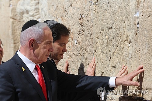 이스라엘 통곡의 벽에서 기도하는 마코 루비오 미국 국무장관과 베냐민 네타냐후 이스라엘 총리 |