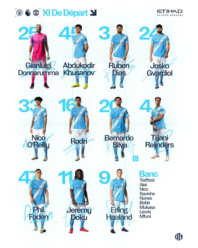 홈팀 맨시티는 4-3-3 포메이션으로 나온다. 도쿠, 홀란, 포든, 라인더르스, 로드리, 실바, 오라일리, 그바르디올, 후벵 디아스, 후사노프, 돈나룸마가 출격한다.
