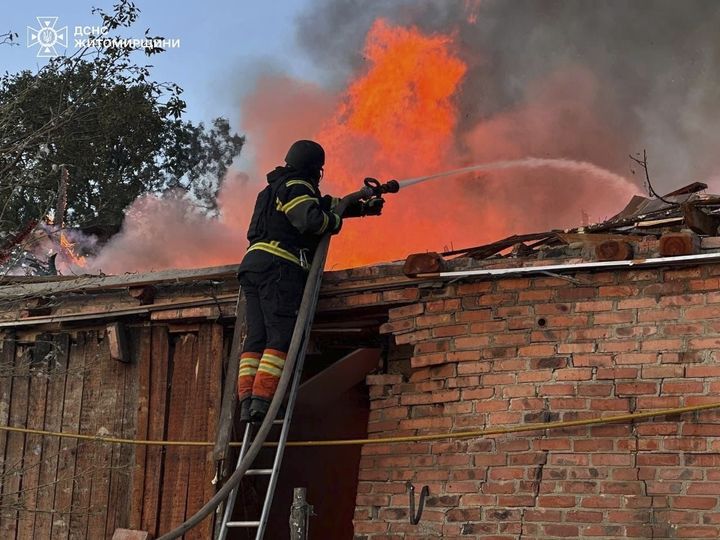 [지토미르=AP/뉴시스] 10일(현지 시간) 우크라이나 지토미르 주거 지역에서 한 소방관이 러시아의 공격으로 파괴된 주택의 화재를 진압하고 있다. 2025.09.15. |