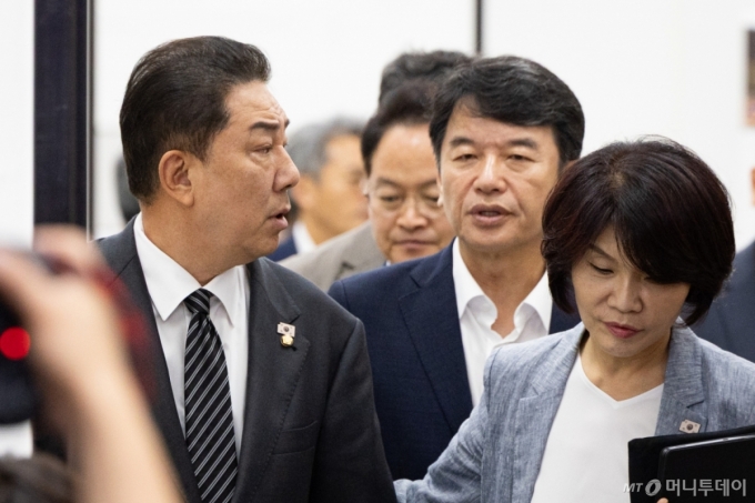 (서울=뉴스1) 유승관 기자 = 김병기 더불어민주당 원내대표(왼쪽부터)와 문진석 원내운영수석부대표, 한정애 정책위의장 등 원내지도부가 11일 서울 여의도 국회에서 열린 정책조정회의에 참석하고 있다. 2025.9.11/뉴스1 Copyright (C) 뉴스1. All rights reserved. 무단 전재 및 재배포, AI학습 이용 금지. /사진=(서울=뉴스1) 유승관 기자 |