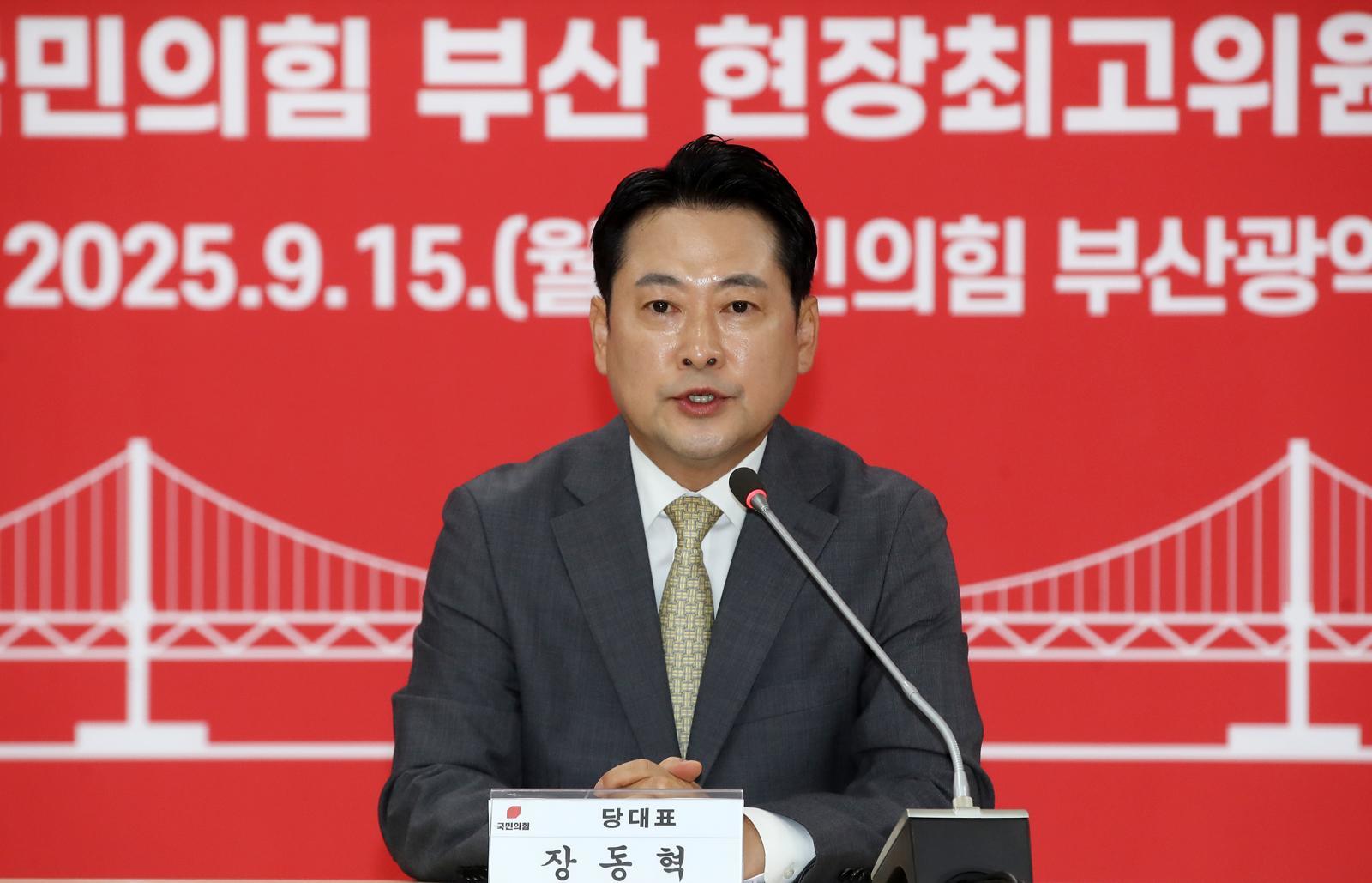 장동혁 국민의힘 대표가 15일 오전 부산 수영구 국민의힘 부산시당에서 열린 현장 최고위원회의에서 발언하고 있다. 2025.9.15/뉴스1 |