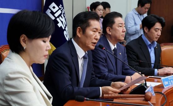 한편 이날 당 지도부는 정 대표와 김병기 원내대표의 불화를 불식하듯 다 함께 손을 맞잡고 인사를 전했다. 정 대표는 발언에서도 "당에서 발생한 모든 문제와 책임은 당대표인 나에게 있다"며 "김병기 원내대표께서 여러 가지로 마음고생도 심하고 힘든 며칠을 보낸 것 같은데, 위로를 드리고 힘내시길 바란다"고 웃으며 말했다.