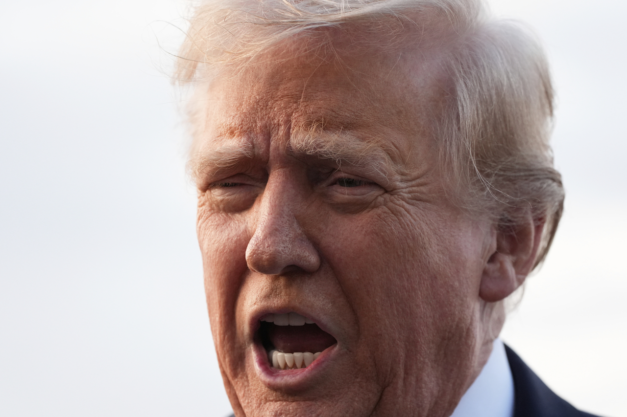 14일(현지시간) 미국 뉴저지주 모리스타운의 모리스타운 공항에서 도널드 트럼프 대통령이 에어포스원에 탑승하기 전 취재진들의 질문에 답하고 있다. [AP] |
