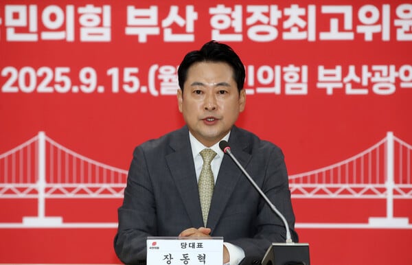 장동혁 국민의힘 대표가 15일 오전, 부산 수영구 국민의힘 부산시당에서 열린 현장 최고위원회의에서 발언하고 있다. photo 뉴스1 |