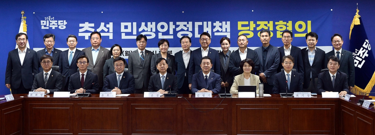 김병기 더불어민주당 원내대표, 구윤철 부총리 겸 기획재정부 장관 및 당-정부 참석자들이 15일 오전 서울 여의도 국회 의원회관에서 열린 추석 민생안정대책 당정협의에서 기념촬영을 하고 있다. 이상섭 기자 |