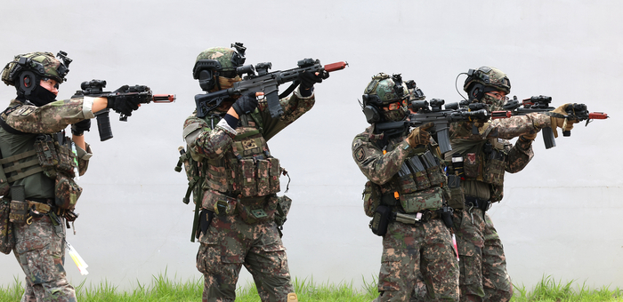 육군 51사단 장병들이 ‘대테러 초동조치훈련 및 도시지역 탐색격멸훈련’을 받고 있다. [사진출처=연합뉴스] |