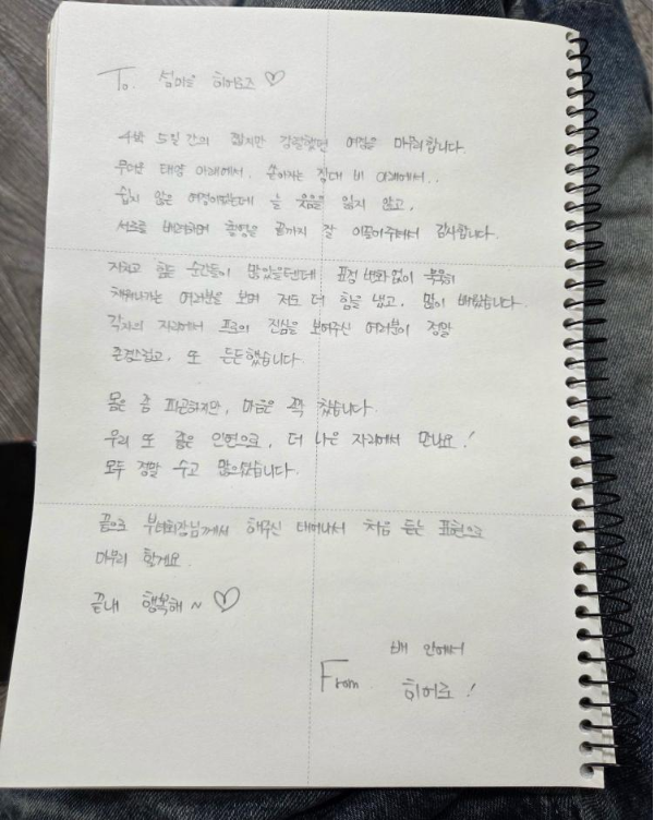 또한 임영웅이 스태프들을 향한 깜짝 손편지로 현장을 감동시켰다는 후문이다. 섬에서 돌아오는 배 위에서 직접 편지를 써 “각자의 자리에서 묵묵히 애써준 스태프들이 진정한 히어로”라며 “언젠가 다시 좋은 인연으로 만나고 싶다”는 따뜻한 메시지를 건넨 것. 이 손편지는 스태프들의 마음을 울리며 마지막 여정을 더욱 특별하게 만들었다는 후문이다.