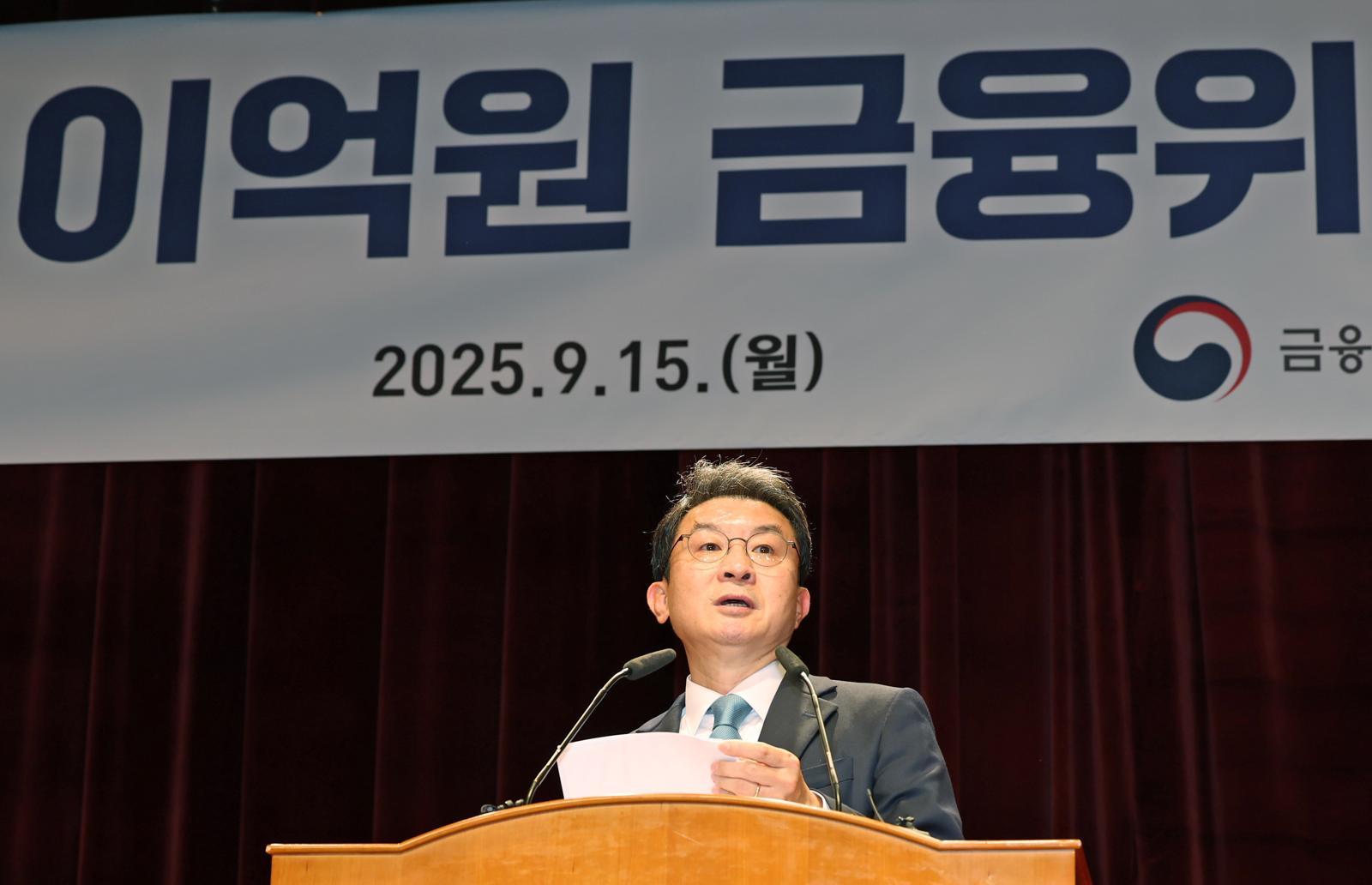 이억원 신임 금융위원회 위원장이 15일 서울 종로구 정부서울청사 별관에서 열린 취임식에서 취임사를 하고 있다. 2025.9.15 뉴스1 |