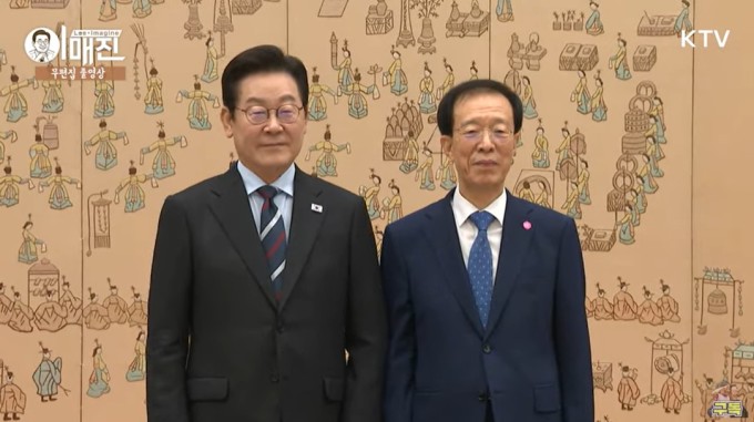 이재명 대통령이 15일 용산 대통령실에서 이석연 국민통합위원장에게 임명장을 수여하고 함께 기념촬영을 하고 있다. [사진=KTV] |