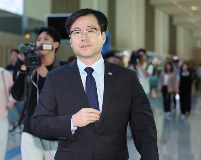 미국에서 한미 관세 협상 후속 협의를 한 김정관 산업통상자원부 장관이 14일 오전 인천국제공항을 통해 귀국하고 있다. 영종도=연합뉴스 |