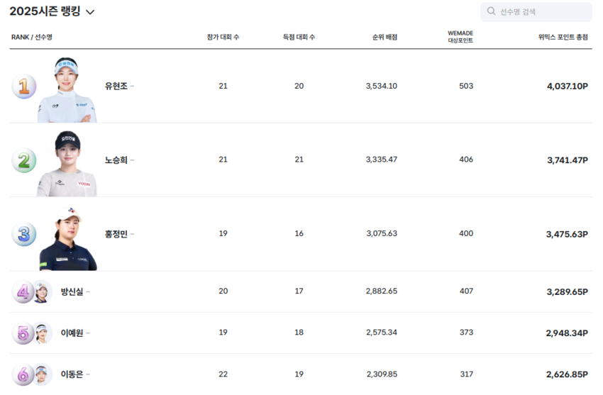 금주 위믹스 포인트 랭킹 TOP5는 1위 유현조(4,037.10점), 2위 노승희(3,741.47점), 3위 홍정민(3,475.63점), 4위 방신실(3,289.65점), 5위 이예원(2,948.34점) 이다. 선수별 보다 자세한 순위는 위믹스 포인트 랭킹 홈페이지(https://wemix.golf.sbs.co.kr/point)를 통해 확인할 수 있다.