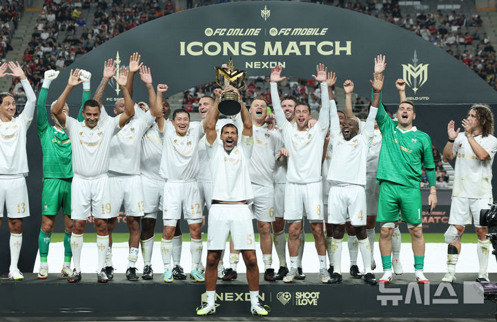 [서울=뉴시스] 홍효식 기자 = 14일 오후 서울 마포구 서울월드컵경기장에서 열린 넥슨 2025 아이콘 매치 FC 스피어(공격수팀)와 쉴드 유나이티드(수비수팀)의 경기, 2-1로 승리한 쉴드 유나이티드 선수들이 트로피를 들고 기뻐하고 있다. 2025.09.14. yesphoto@newsis.com |