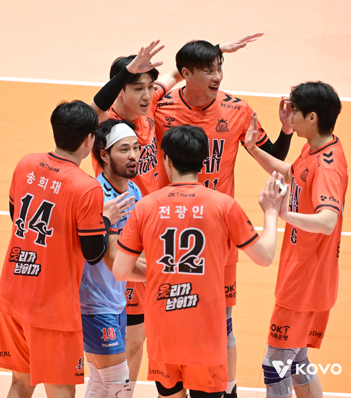 OK저축은행은 15일 전남 여수 진남체육관에서 열린 2025 여수·NH농협컵 프로배구대회 남자부 A조 조별리그 2차전에서 KB손해보험을 세트스코어 3-0(25-11 25-20 26-24)으로 꺾었다.