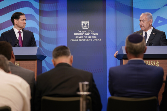 15일(현지시간) 이스라엘 예루살렘에서 공동 기자회견 중인 베냐민 네타냐후 이스라엘 총리(오른쪽), 마코 루비오 미국 국무장관. [AP=연합뉴스] |