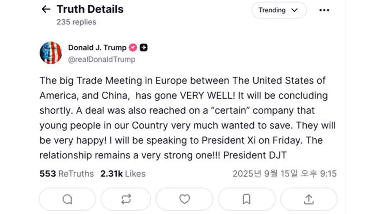 트럼프 대통령은 현지 시간 15일 소셜미디어 트루스소셜에 올린 글에서 "유럽에서 열린 미국과 중국의 큰 무역협상이 곧 결론이 날 것"이라며 이같이 언급했습니다.