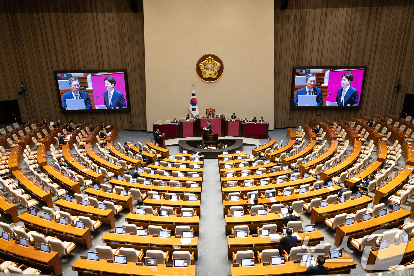 이준석 개혁신당 대표가 15일 오후 서울 여의도 국회에서 열린 제429회국회(정기회) 제5차 본회의에서 정치에 관한 대정부 질문을 하는 가운데 의원들의 빈자리가 보이고 있다. 2025.9.15/뉴스1 ⓒ News1 이승배 기자 |