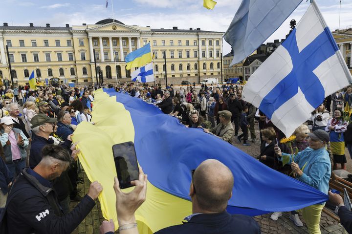 [헬싱키=AP/뉴시스] 유럽연합이 러시아 접경국의 국방을 강화하면서 핀란드 국경에 무인기 장벽을 만들겠다고 9월 15일 밝혔다. 사진은 2025년 8월 24일 핀란드 헬싱키에서 우크라이나 독립기념일을 맞아 연대 집회가 열려 참가자들이 대형 우크라이나 국기를 펼치고 있는 광경. 우크라이나는 러시아와 4년째 전쟁 중에 독립 34주년을 맞았다. 2025.09.16. |