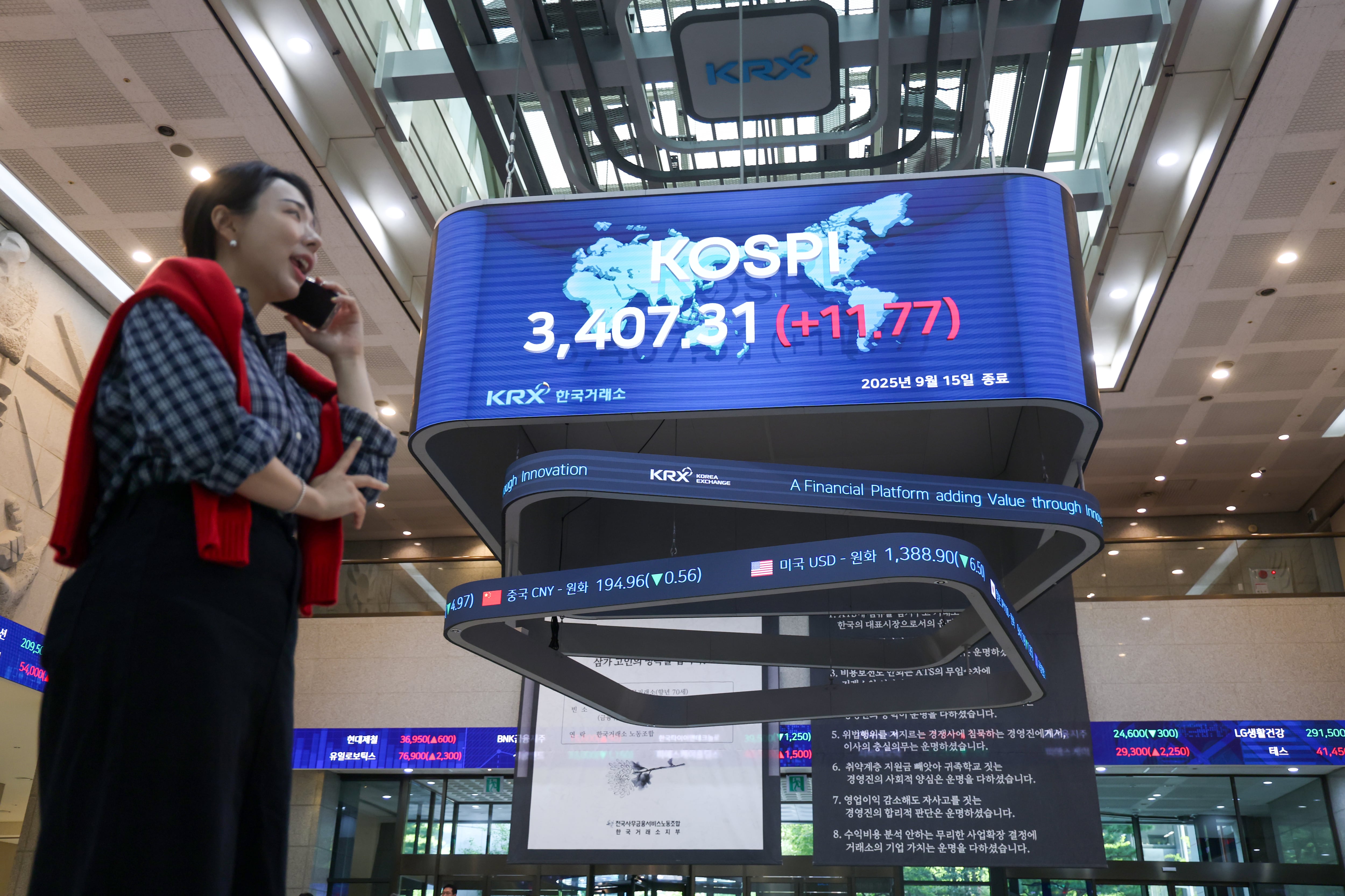 2025년 9월 15일 오후 서울 영등포구 여의도 한국거래소에서 코스피 지수가 표시되고 있다. 이날 코스피는 전날 대비 11.77포인트 오른 3,407.31에 종료 됐다./연합뉴스 |