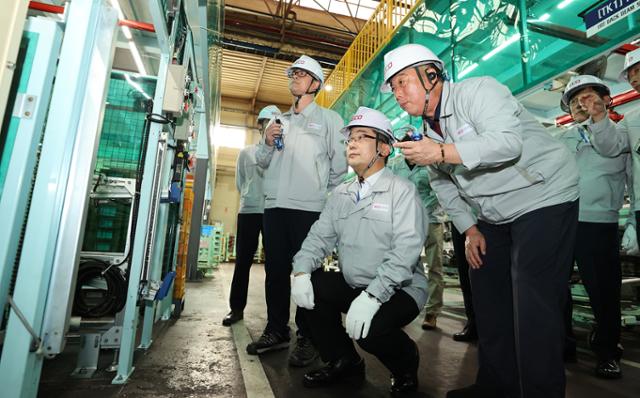 이호성(오른쪽에서 두 번째) 하나은행장이 15일 '자동차 산업 수출 공급망 강화를 위한 금융지원' 1호 기업인 (주)서진산업 경기도 시흥 본사를 방문해 최재홍(맨 오른쪽) 서진산업 대표이사로부터 생산시설에 대한 설명을 듣고 있다. 하나은행 제공 |