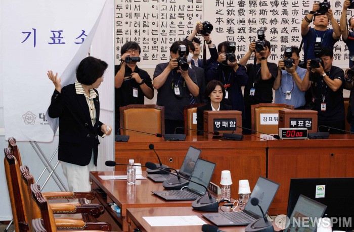 [서울=뉴스핌] 윤창빈 기자 = 추미애 국회 법제사법위원장이 16일 오전 서울 여의도 국회에서 열린 법제사법위원회 전체회의에서 나경원 국민의힘 의원의 간사 선임의 건에 대한 투표를 하고 있다. 2025.09.16 pangbin@newspim.com |
