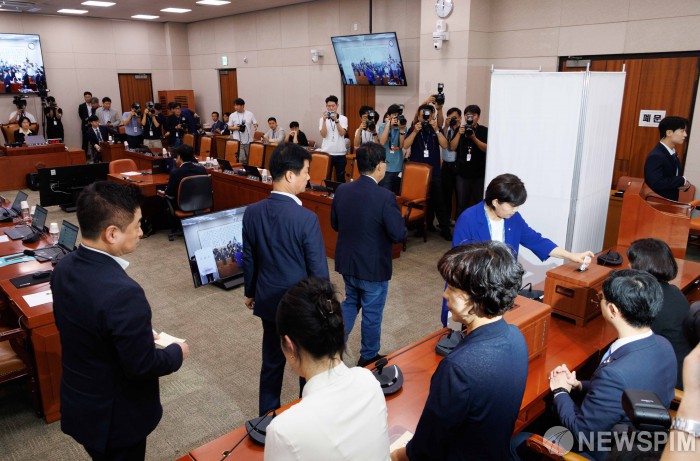 [서울=뉴스핌] 윤창빈 기자 = 16일 오전 서울 여의도 국회에서 열린 법제사법위원회 전체회의에서 나경원 국민의힘 의원의 간사 선임의 건을 두고 무기명 투표가 진행되고 있다. 2025.09.16 pangbin@newspim.com