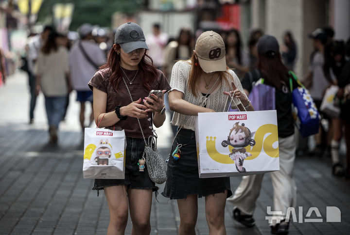 [서울=뉴시스] 정병혁 기자 = 서울 중구 명동거리를 찾은 외국인 여행객들이 쇼핑백을 들고 이동하고 있다. 2025.08.27. jhope@newsis.com |
