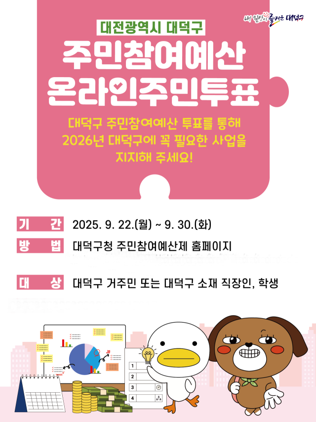 대전시 대덕구가 오는 22일부터 30일까지 2026년 주민참여예산 사업 선정을 위한 온라인 주민투표를 진행한다.