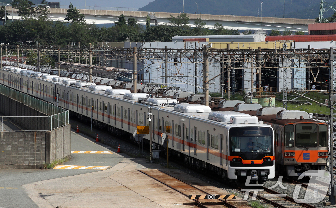 (부산=뉴스1) 윤일지 기자 = 16일 부산 금정구 부산교통공사 노포차량기지에 열차가 대기 중이다. 부산지하철 노사 대표들은 이날 오후 임단협 최종교섭을 벌이고 있다. 노조는 최종교섭이 결렬되면 다음날인 17일 첫 차부터 파업에 나설 예정이다. 2025.9.16/뉴스1