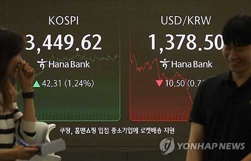 코스피지수는 전날보다 42.31포인트(1.24%) 상승한 3,449.62로 거래를 마쳐 종가 기준 사상 최고치를 경신했다.