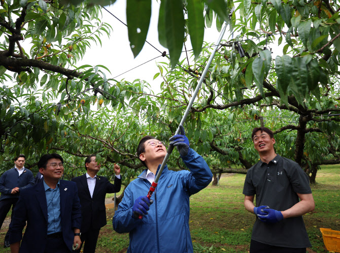 이재명 대통령이 16일 청년 농업인이 운영하는 세종시 전동면 조일농원에서 복숭아 가지치기를 체험하고 있다.(사진=연합뉴스) |