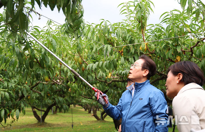 [세종=뉴시스] 고범준 기자 = 이재명 대통령이 16일 세종시 전동면 조일농원 복숭아 농장을 방문해 가지치기 체험을 하고 있다. (대통령실통신사진기자단) 2025.09.16. bjko@newsis.com |