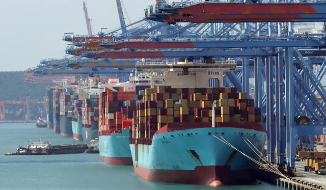 14일 부산 강서구 부산항신항 부두에서 수출입 컨테이너 선적 및 하역작업이 진행되고 있다. 뉴시스 |