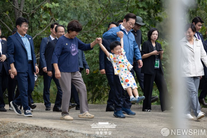 [서울=뉴스핌] 이재명 대통령이 16일 세종시 전동면 조일농원에서 열린 청년 농업인 간담회에 향하며 어린아이와 즐거운 시간을 보내고 있다. [사진=대통령실] 2025.09.16 photo@newspim.com