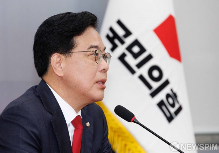 [서울=뉴스핌] 윤창빈 기자 = 송언석 국민의힘 원내대표가 17일 오전 서울 여의도 국회에서 현안과 관련한 취재진의 질문에 답변하고 있다. 2025.09.17 pangbin@newspim.com