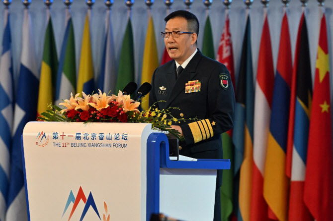 동쥔 중국 국방부장이 지난해 9월 13일 베이징 국제컨벤션센터에서 열린 샹산포럼 개막식에서 연설하고 있다. (사진=AFP) |