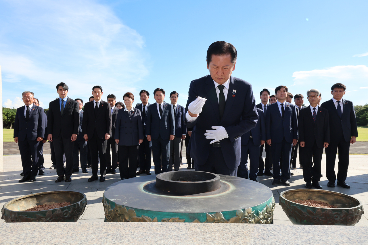 정 대표는 “77년이 지났지만 4·3 희생자들의 명예회복과 진상규명은 여전히 현재 진행형”이라며 “이재명 정부와 민주당은 제주의 눈물이 다시 반복되지 않도록 하겠다”고 약속했다. 아울러 “4·3 정신을 계승하고 미흡한 제도와 법을 보완해 유족들의 슬픔을 보듬고 희생자들의 완전한 명예회복을 위해 힘쓰겠다”고 강조했다.