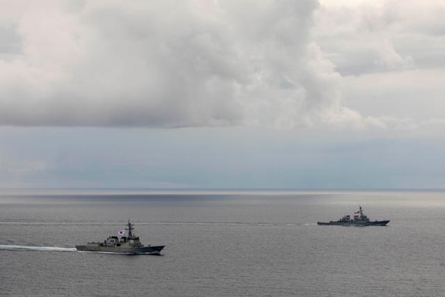 16일 제주 남방 공해상에서 한미일 3국 함정들이 2025년 프리덤 에지 훈련을 하고 있다. 왼쪽은 우리 해군의 율곡 이이함, 오른쪽은 미 해군의 커티스 윌버 구축함. 미 해군 제공 |