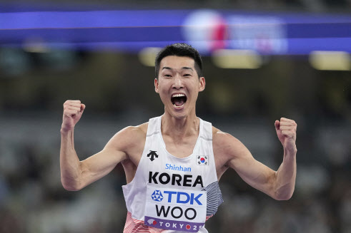 South Korea‘s Woo Sang-hyeok reacts after an attempt in the men’s high jump final at the World Athletics Championships in Tokyo, Tuesday, Sept. 16, 2025. (AP Photo/Matthias Schrader)뉴시스 제공 |