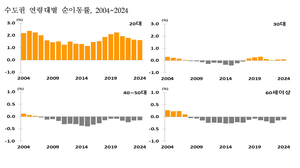 특히 청년층(19~34세)의 수도권 순유입이 최근 20년 동안 꾸준히 지속되면서 수도권 집중화 현상을 이끈 것으로 파악됐습니다.