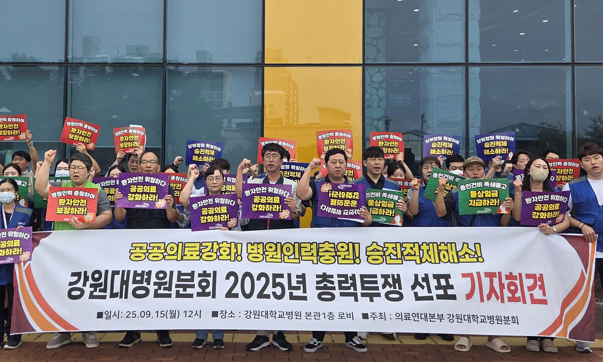 오서연 강원대병원 조합원은 “우리 임금은 여전히 최저임금 수준이다. 25년을 일해도 기본급은 230만원을 겨우 넘는다”며 “1년에 9000원, 한 달로 나누면 커피 한 잔 값도 안 되는 호봉 인상분이 전부”라고 토로했다. 그러면서 “건물은 점점 늘어나는데 일할 사람은 줄어든다. 저임금 때문”이라며 “병원 노동자 이야기에 귀 기울여 달라”고 호소했다.
