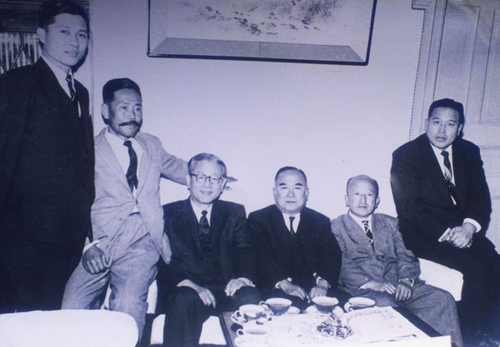 김대중 전 대통령(맨 왼쪽)이 장면 부통령(왼쪽 세 번째) 등과 함께 촬영한 사진 |