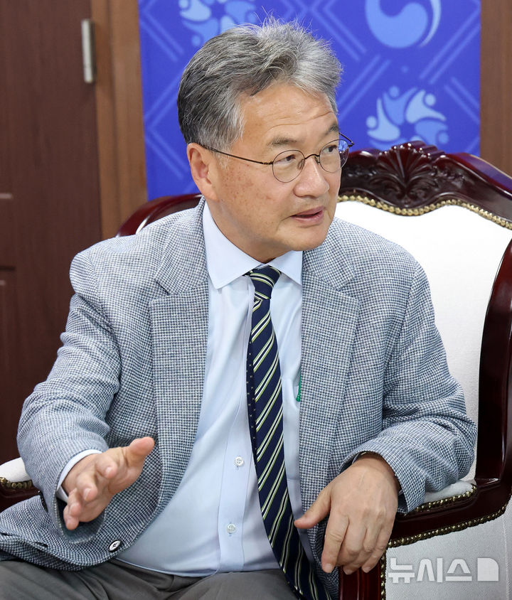 [서울=뉴시스] 추상철 기자 = 조셉 윤 주한미국대사 대리가 1일 오후 서울 종로구 정부서울청사에서 정동영 통일부 장관과 대화를 하고 있다. 2025.08.01. scchoo@newsis.com |