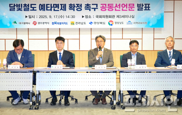 ▲강기정 광주광역시장이 17일 국회 제3세미나실에서 영·호남 시·도지사 및 달빛철도 경유지역 국회의원들과 함께 '달빛철도 예비타당성조사 면제 확정을 촉구하는 공동선언'을 발표하고 있다. 2025.09.17 ⓒ광주광역시 |