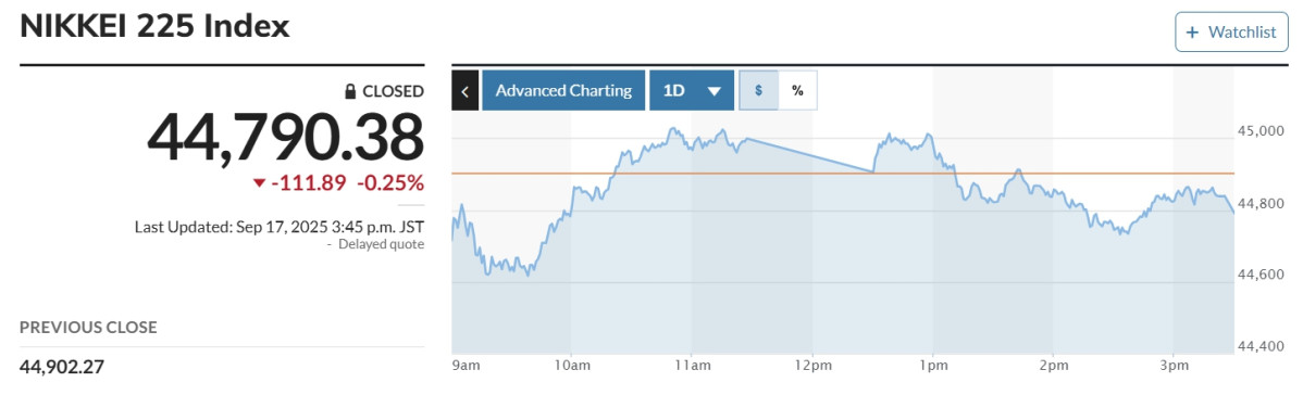 마켓워치에 따르면 일본증시 닛케이225(닛케이)는 전날보다 111.89포인트(0.25%) 내린 4만4790.38엔으로 마감했다. 기술주 중심의 토픽스는 급락 출발 후 약보합권에 머물렀다. 종가는 22.53포인트(0.71%) 내린 3145.83이었다.
