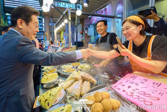 이 대통령은 상인들과 일일이 악수하고 셀카 촬영 요청에 응하면서 체감 경기가 어떤지 물었다. 상인들은 "힘들지만 점점 더 나아지고 있다" "대통령께서 더 애써 달라"고 화답했다.
