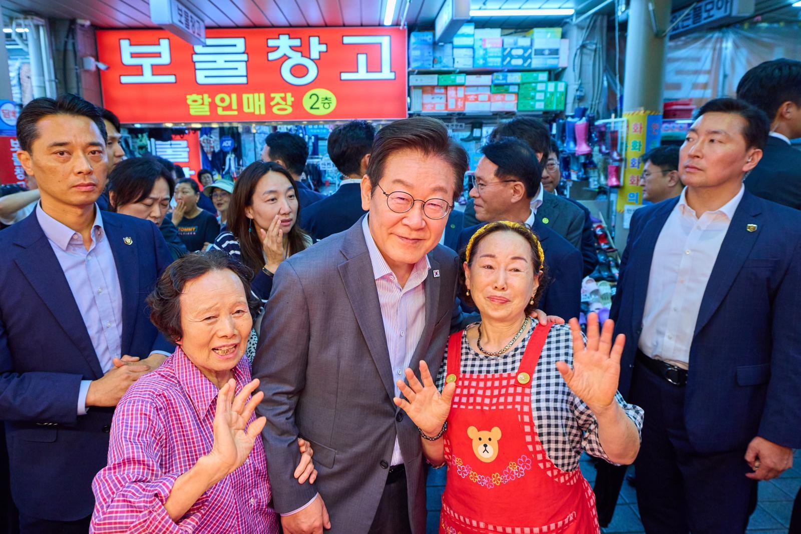 이 대통령은 상인들을 보며 “더 젊어지신 것 같다” 등 인사를 건넸다. 한 상인은 “성남시장 하실 때 꼬맹이던 아들이 중학생이 됐는데 대통령은 10년 전과 똑같다, 하나도 안 늙었다”고 말했다. 이에 이 대통령은 “저는 제가 많이 늙은 줄 알았는데요?”라며 웃었다.