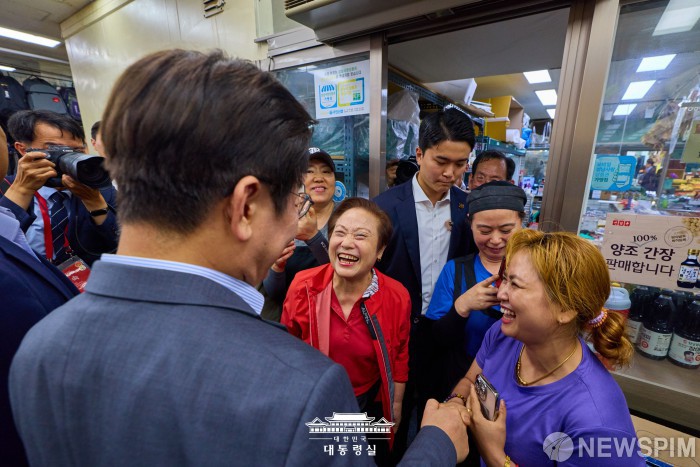 [서울=뉴스핌] 이재명 대통령이 17일 성남시 태평동 현대시장을 방문해 시민들과 인사를 나누고 있다. [사진=대통령실] 2025.09.17 photo@newspim.com