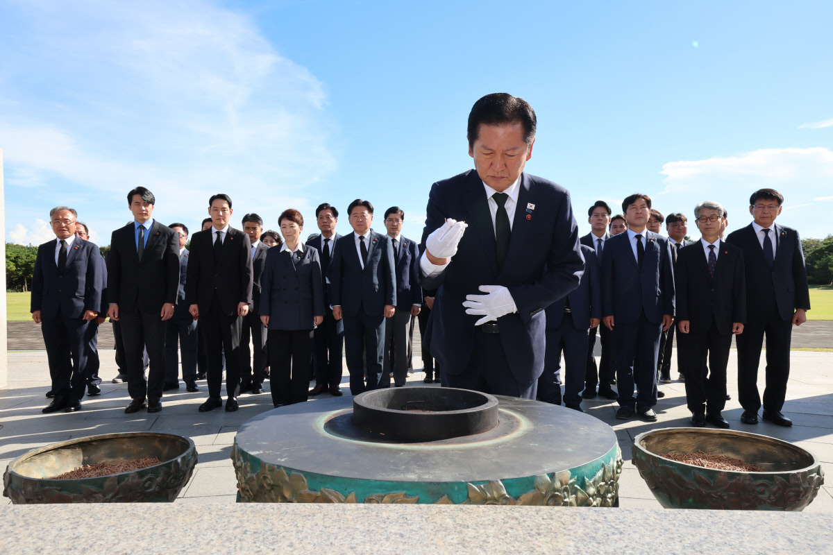 제주 찾은 여당 지도부 정청래 대표를 비롯한 더불어민주당 지도부가 17일 제주 4·3평화공원을 찾아 참배하고 있다. 연합뉴스 |