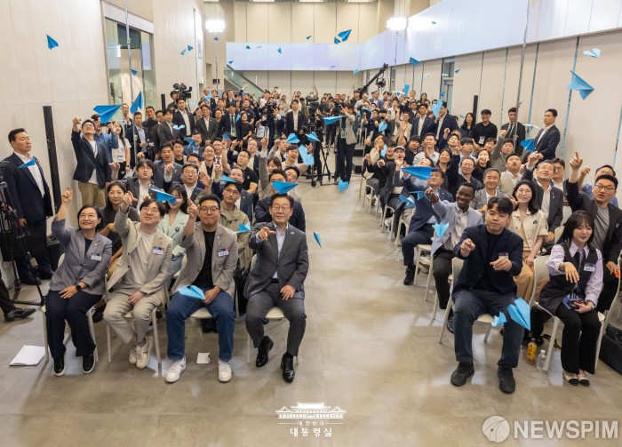 [서울=뉴스핌] 이재명 대통령이 17일 경기도 성남시 스타트업 스퀘어에서 열린 청년 스타트업 상상콘서트에서 참석자들과 종이비행기를 날리고 있다. [사진=대통령실] 2025.09.17 photo@newspim.com
