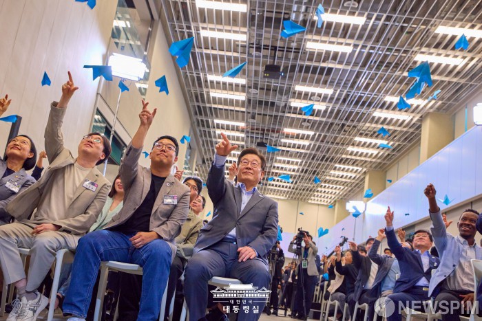 [서울=뉴스핌] 이재명 대통령이 17일 경기도 성남시 스타트업 스퀘어에서 열린 청년 스타트업 상상콘서트에서 참석자들과 종이비행기를 날리고 있다. [사진=대통령실] 2025.09.17 photo@newspim.com |
